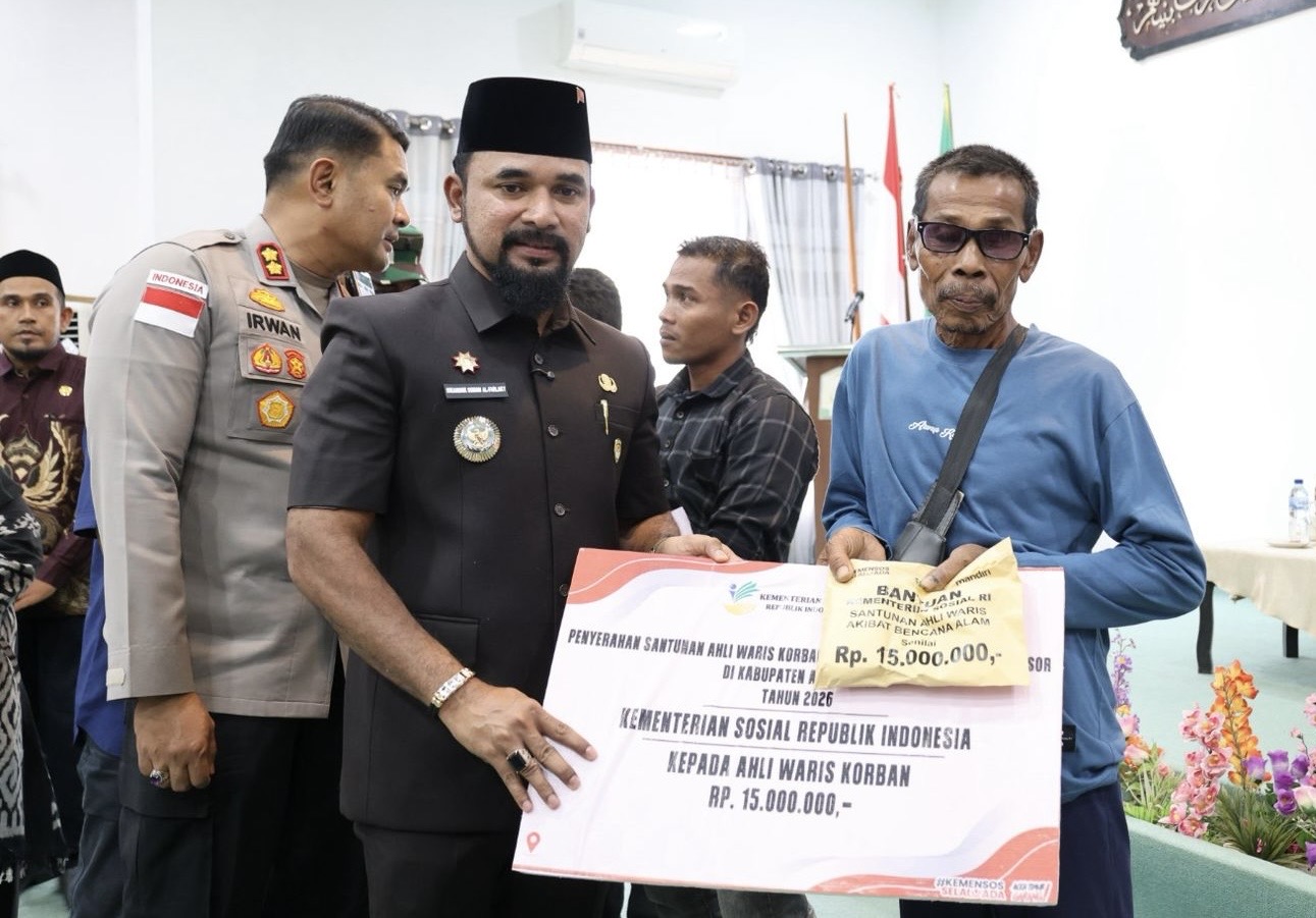 ACEH TIMUR | Bupati Aceh Timur, Iskandar Usman Al-Farlaky, menyerahkan santunan kepada 58 ahli waris korban bencana alam banjir dan longsor di Kabupaten Aceh Timur. Penyerahan santunan tersebut berlangsung di Aula Serbaguna Pendopo Idi, Kamis, 29 Januari 2026.