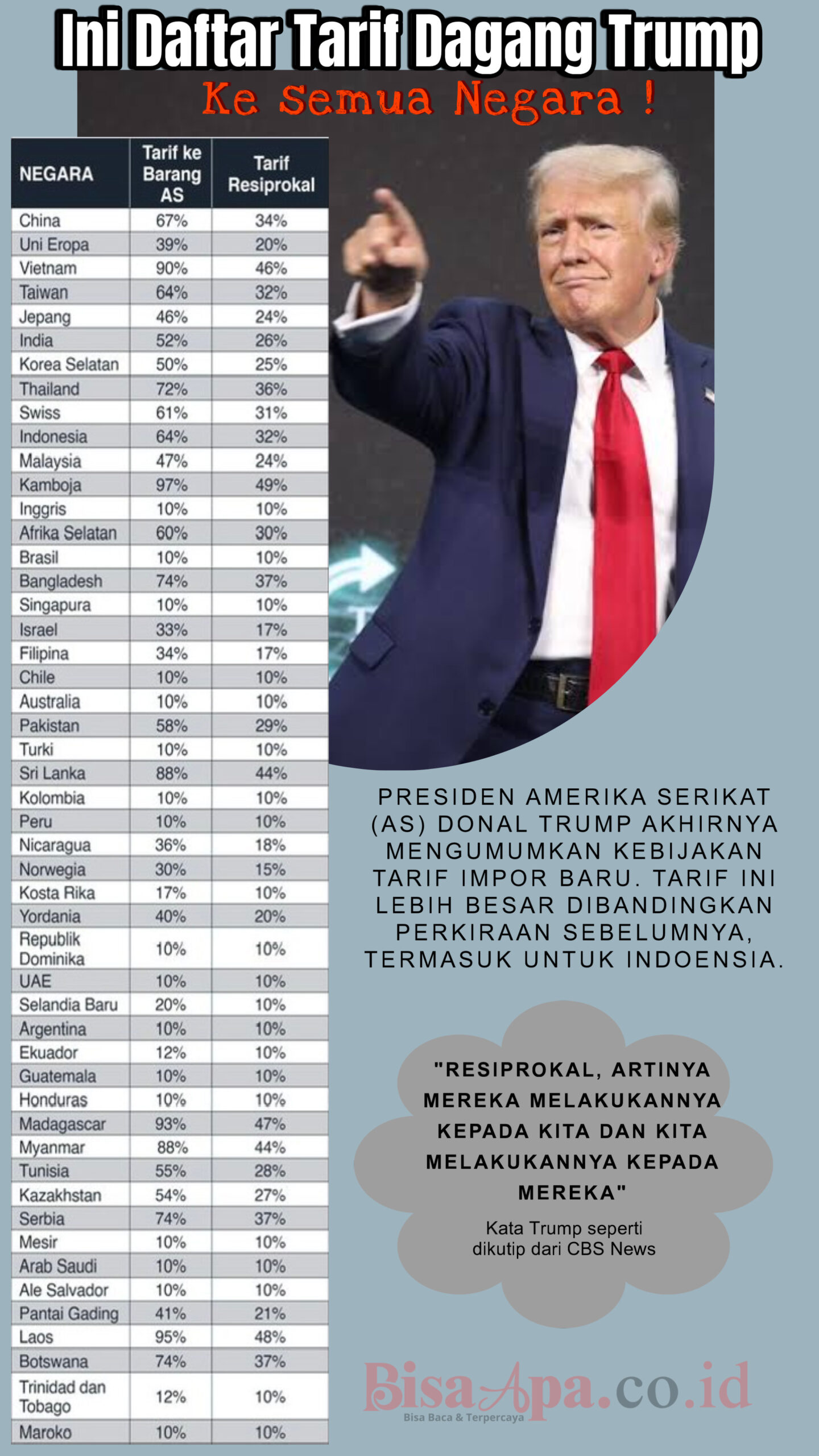 Presiden Amerika serikat (AS) Donald Trump akhirnya mengumumkan kebijakan tarif impor baru. Tarif ini lebih besar dibandingkan perkiraan sebelumnya, termasuk untuk Indonesia.