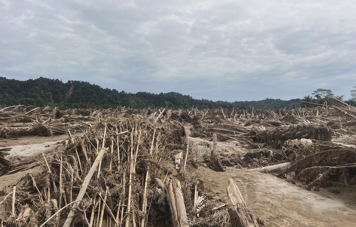 “Rumah warga disini semuanya hanyut, air setinggi pohon kelapa sawit. Disini kita juga menemukan tumpukan kayu-kayu akibat rumah yang dihantam banjir,” jelasnya.