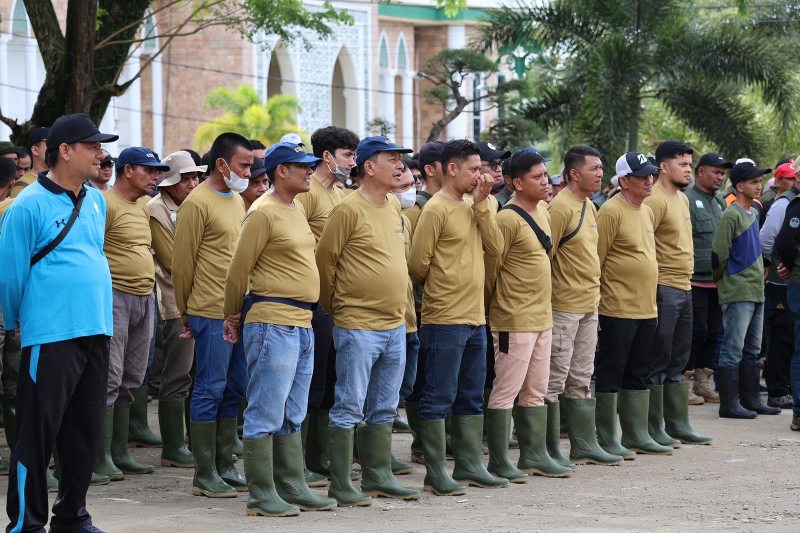 ACEH TIMUR | Bupati Aceh Timur, Iskandar Usman Al-Farlaky, memimpin apel penyambutan rombongan gotong royong massal dari Satuan Kerja Perangkat Aceh (SKPA) Provinsi Aceh di halaman Pendopo Bupati Aceh Timur, Senin (29/12/2025).