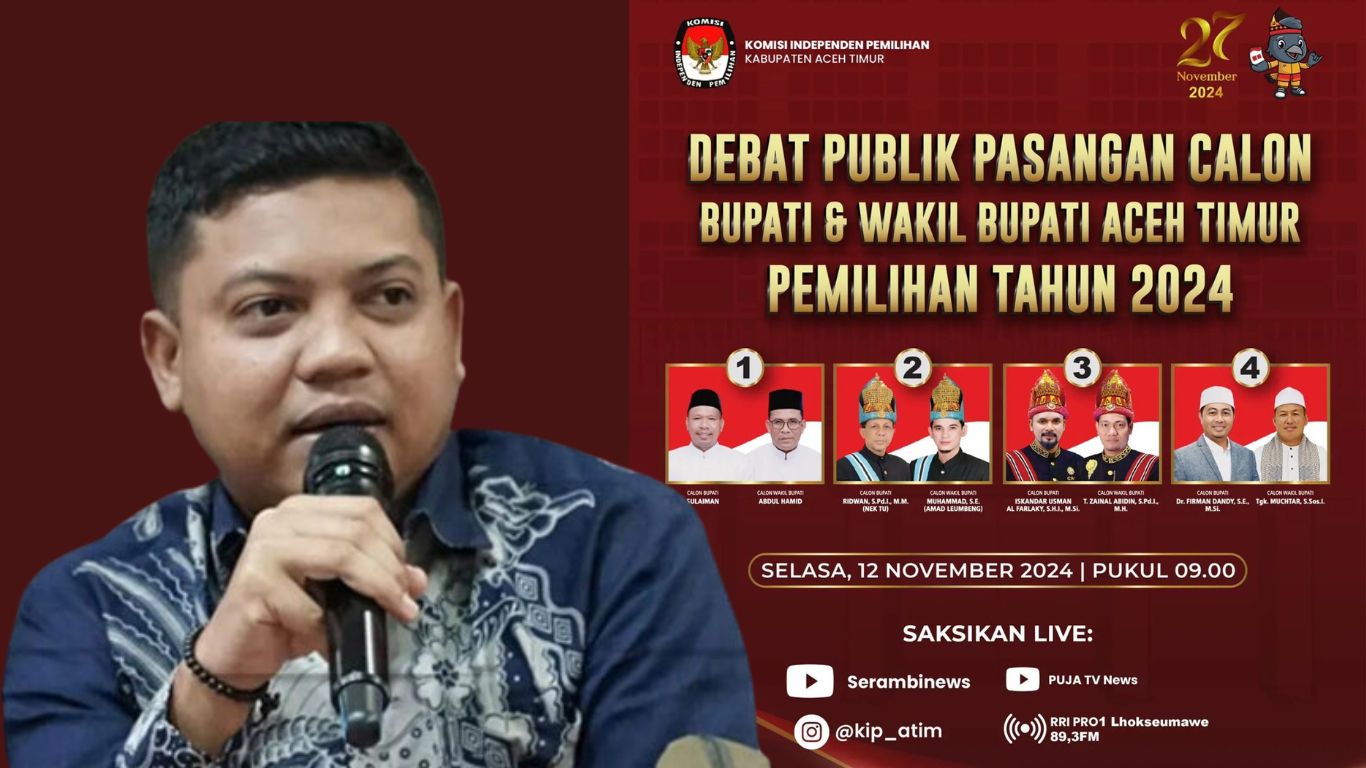 Anggota Komisi Independen Pemilihan atau KIP Aceh Timur, Sayed Reza Fachlevi menjelaskan debat kandidat calon Bupati dan Wakil Bupati akan dilaksanakan di Aula Media Centre Dinas Perhubungan Aceh Timur yang berlokasi di Peureulak Kota, pada hari Selasa, 12 November 2024, Pagi Hari.
