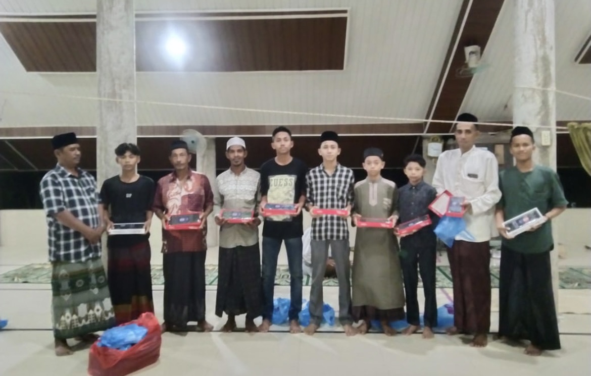 Penyerahan sarung itu dilakukan kepada Imam dan 25 bilal Terawih di meunasah desa setempat, pada Jumat malam, 28 Maret 2025.