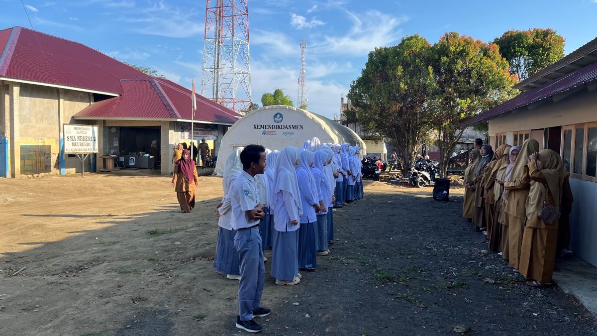 PIDIE JAYA | Halaman SMA Negeri 2 Meureudu masih tertutup lumpur yang mengeras setinggi dua meter, Senin 30 April 2026. Bendera di tiang karatan itu robek di ujungnya. Apel hari pertama usai Idulfitri hanya dihadiri 30 persen dari 271 siswa.