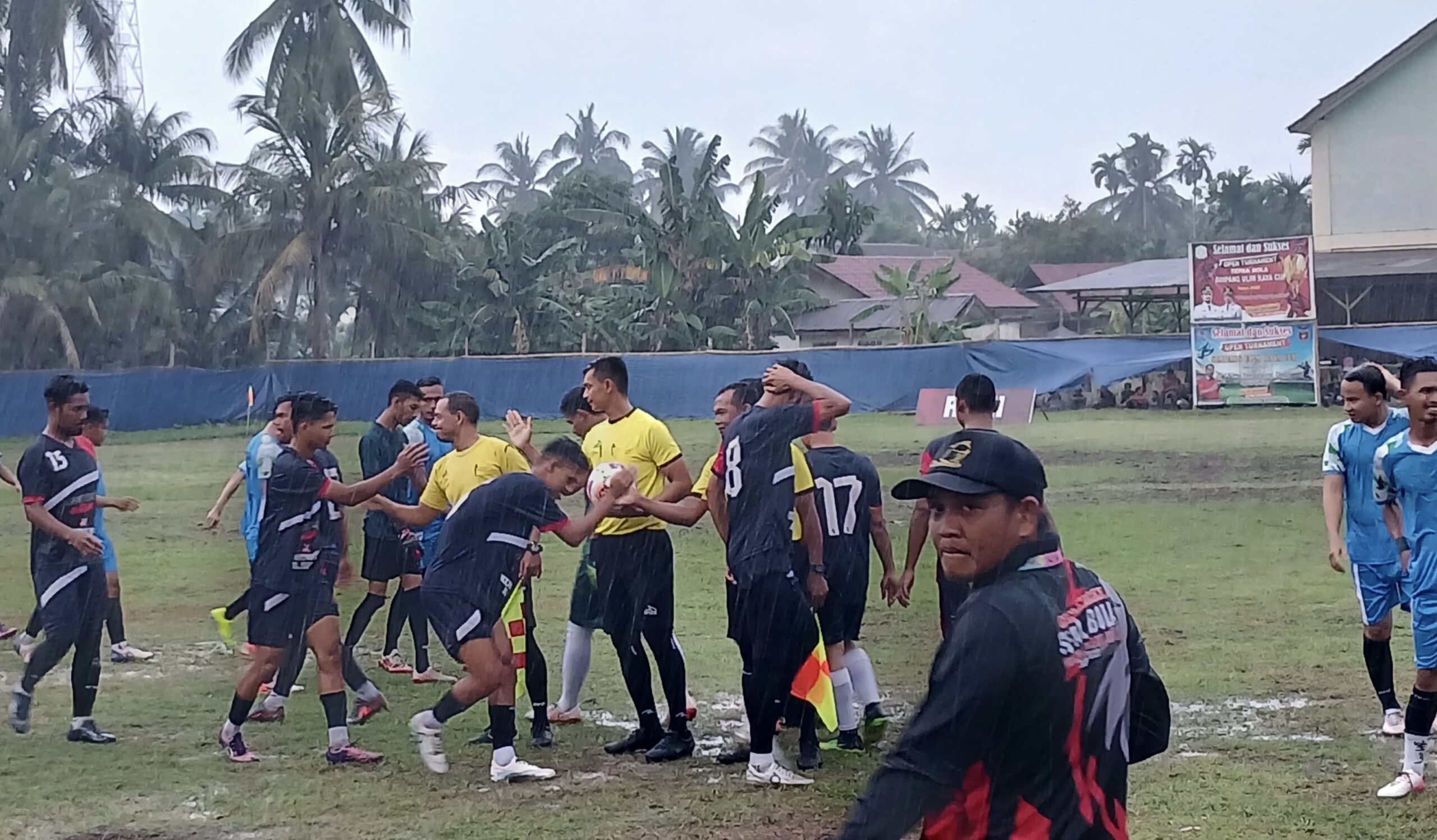 Aceh Timur | Hujan lebat tidak menghalangi pelaksanaan laga pembuka perempat final Simpang Ulim Raya Cup I Tahun 2025 di lapangan sepak bola Gampong Blang pada Selasa sore, 13 Mei 2025.