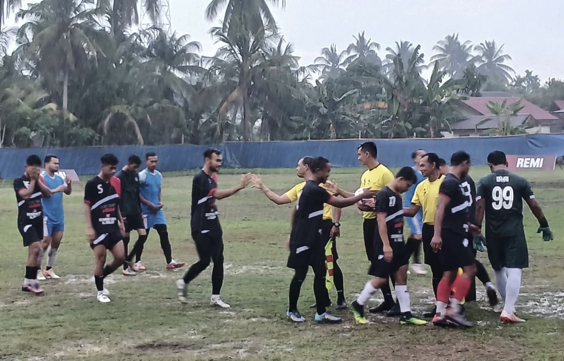 Aceh Timur | Hujan lebat tidak menghalangi pelaksanaan laga pembuka perempat final Simpang Ulim Raya Cup I Tahun 2025 di lapangan sepak bola Gampong Blang pada Selasa sore, 13 Mei 2025.