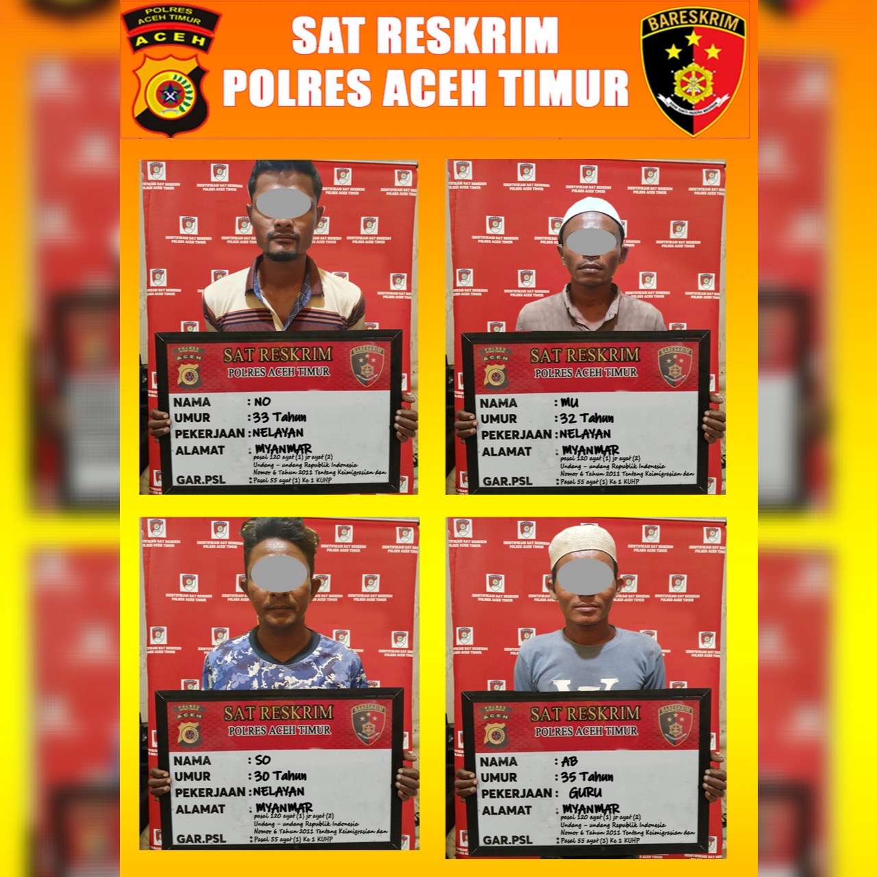 Kasat Reskrim Polres Aceh Timur, Iptu Adi Wahyu Nurhidayat menetapkan 4 WNA sebagai tersangka tindak pidana penyelundupan manusia sebagaimana dimaksud dalam pasal 120 ayat (1) UU Nomor 6 Tahun 2011 Tentang Keimigrasian setelah melakukan penyelidikan di lapangan.