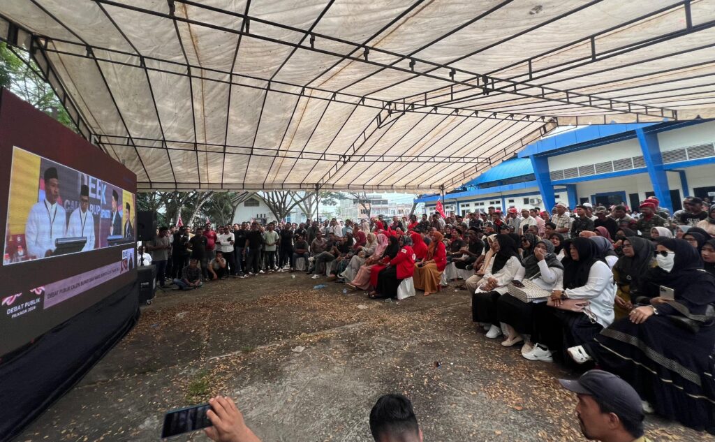 Idi Rayeuk | Ratusan pendukung Calon Bupati Aceh Timur nonton bareng (Nobar) debat kandidat di halaman Dinas Hubungan setempat, Desa Lhok Dalam, Peurelak.