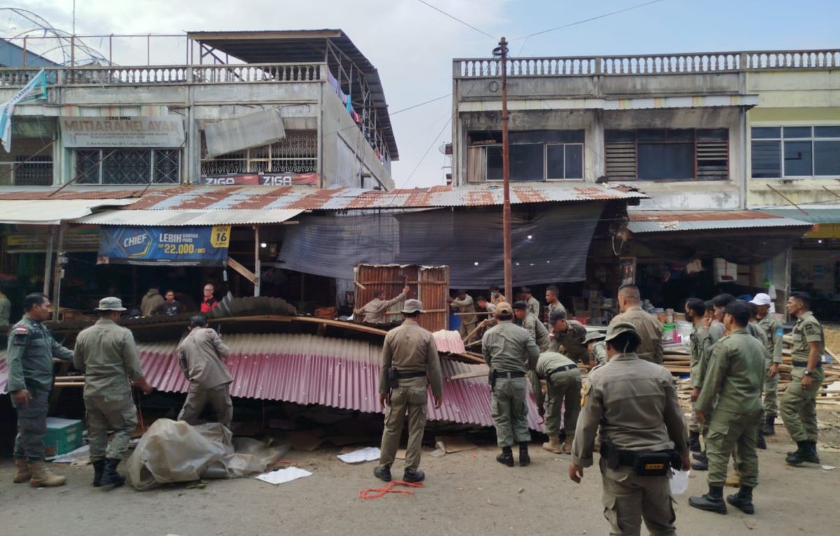 LANGSA | Satuan Polisi Pamong Praja (Satpol PP) Kota Langsa mengambil tindakan tegas dengan membongkar 12 lapak pedagang kaki lima yang masih tersisa di Pasar Induk Langsa pada Selasa, 3 Febuari 2026.