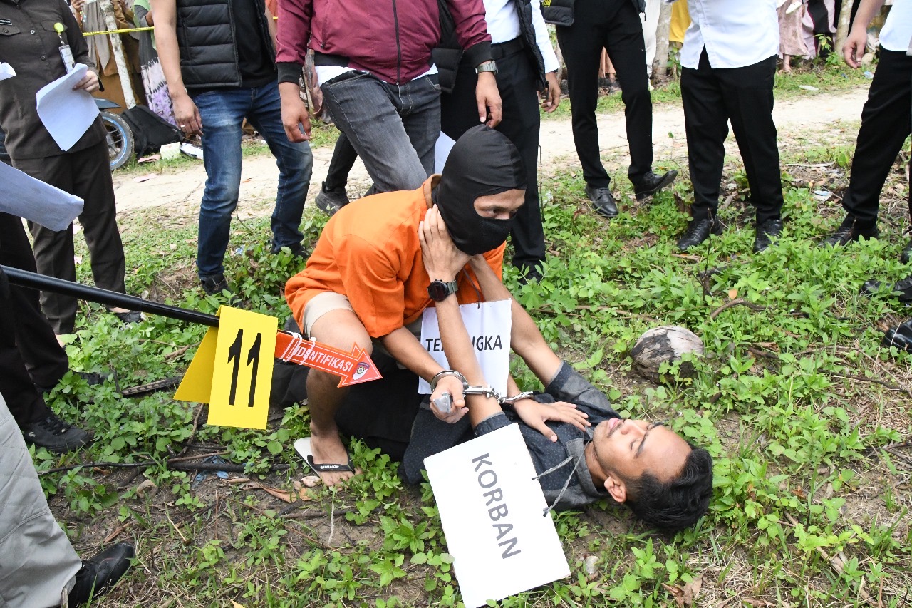 Aceh Timur | Satreskrim Polres Aceh Timur melakukan rekonstruksi kasus pembunuhan Bustamam (26) warga Desa Bantayan Barat, Kecamatan Idi Tunong, Kabupaten Aceh Timur yang terjadi pada 3 September 2025.